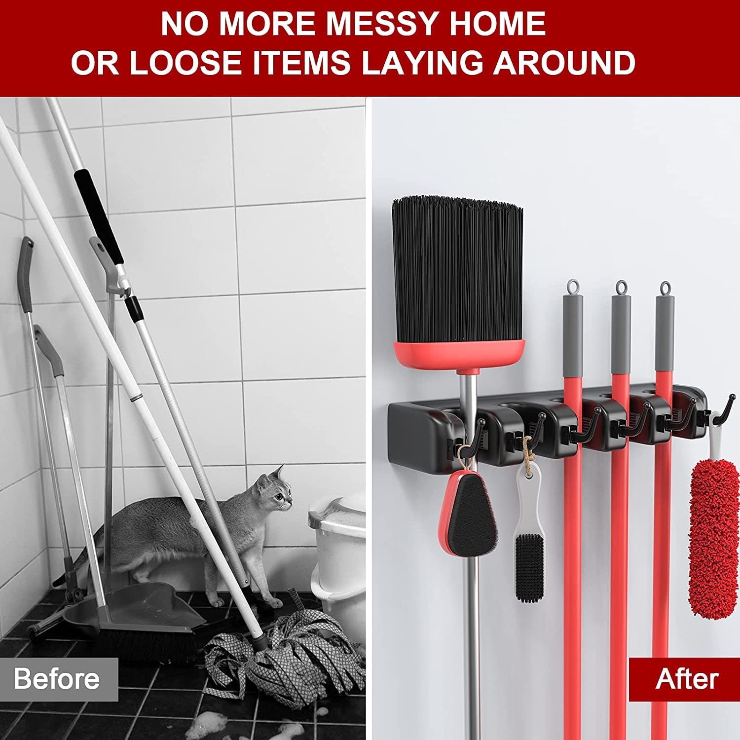 • NO-SLIDE- Wall-mounted mop and broom holder with spring-loaded, double rubber gripped slots, whether wet mops, dirty rakes, or baseball bats, can easily hold heavy tools with a no-slip grip