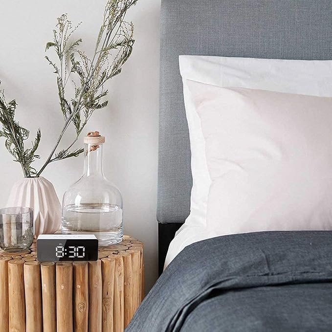 The MD SALES LED alarm clock features a stylish mirror design with a large digital display and multifunctional capabilities including time display, alarm, snooze, temperature display, night mode, and mirror utility. Its loud alarm gradually increases in volume and speed to help you wake up naturally, with customizable snooze settings—just press the “SNA LIGHT” button for a 5-minute delay unless turned off manually. This elegant and practical clock makes a perfect gift for birthdays, Christmas, or New Year and adds a sleek touch to any bedroom décor. It offers dual power options: USB plug-in or 3 AAA batteries (not included). While powered by battery, press any button to view the time; with USB, the display stays continuously lit.